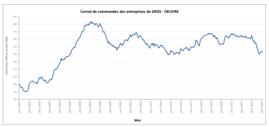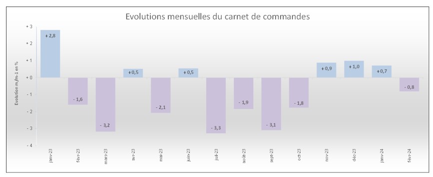 Vous trouverez ci-dessous les variations mensuelles des carnets de commandes1 des entreprises de gros œuvre pour les mois de janvier 2023 à février 2024.