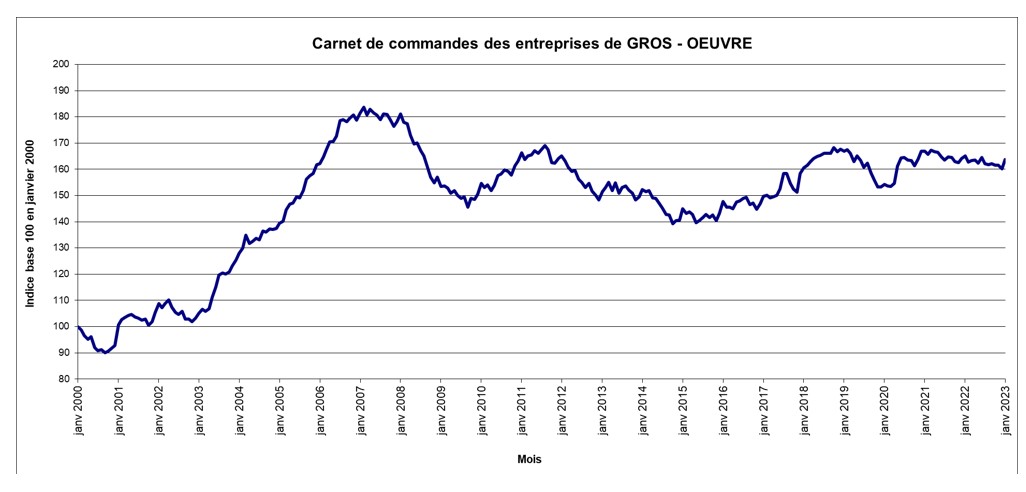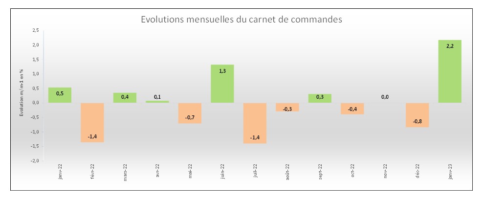 Vous trouverez ci-dessous les variations mensuelles des carnets de commandes1 des entreprises de gros œuvre pour les mois de janvier 2022 à janvier 2023.