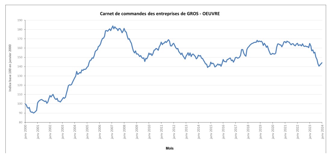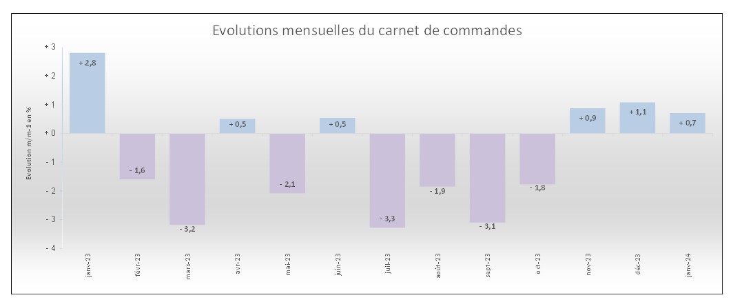 Vous trouverez ci-dessous les variations mensuelles des carnets de commandes1 des entreprises de gros œuvre pour les mois de janvier 2023 à janvier 2024.