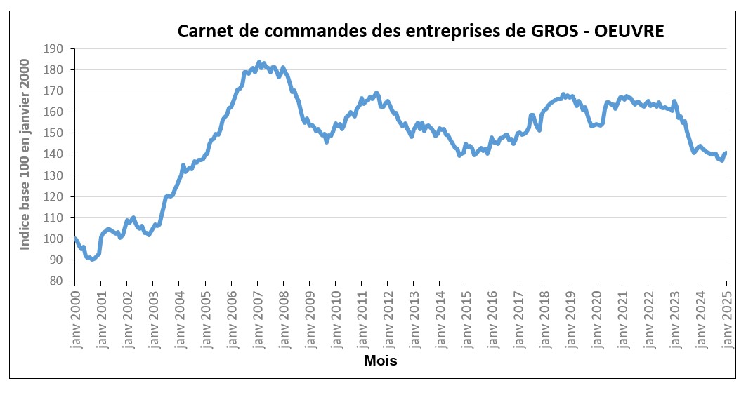 Vous trouverez ci-dessous les variations mensuelles des carnets de commandes1 des entreprises de gros œuvre pour les mois de janvier 2024 à janvier 2025.