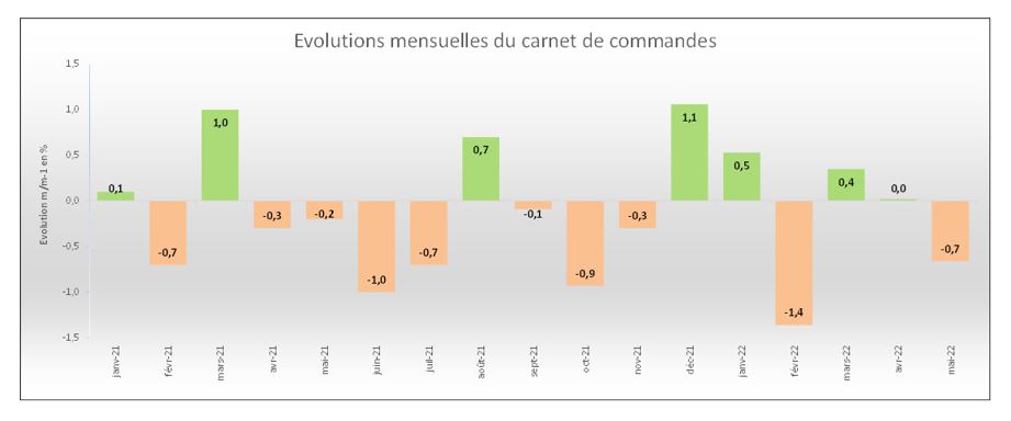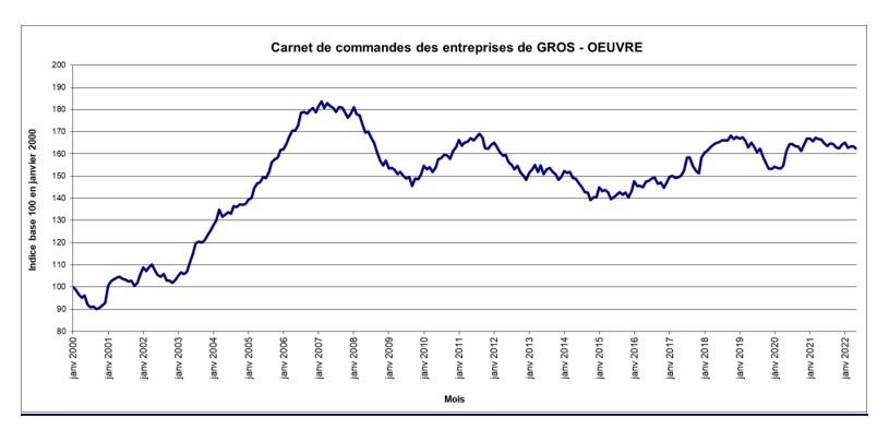 Vous trouverez ci-dessous les variations mensuelles des carnets de commandes1 des entreprises de gros œuvre pour les mois de janvier 2021 à mai 2022.