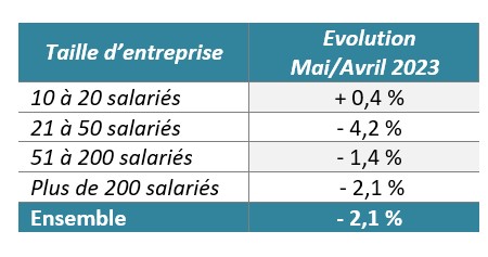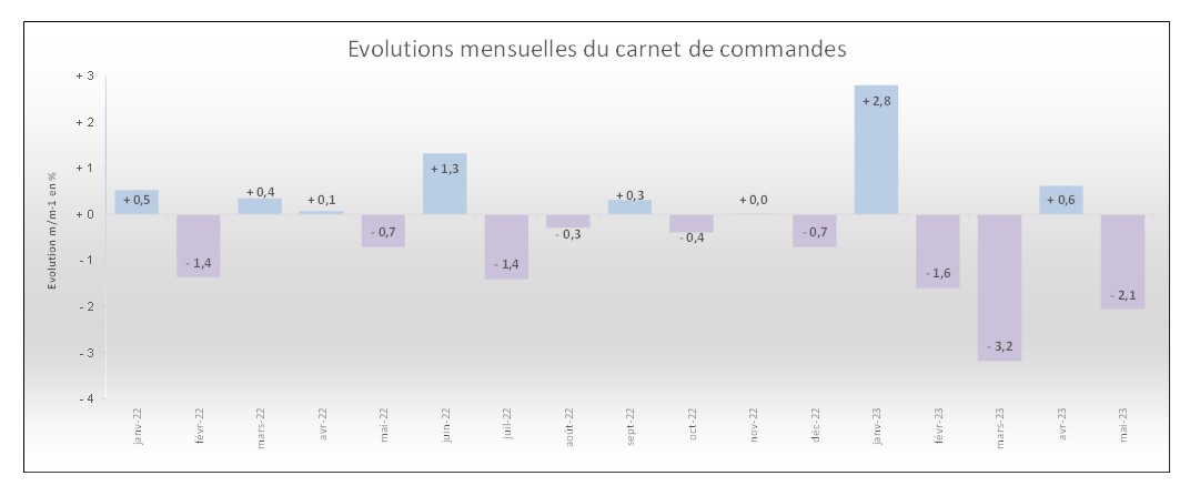 Les carnets de commandes du mois de mai 2023 ressortent en baisse par rapport à avril 2023. Seuls les carnets de commandes des entreprises de 10 à 20 salariés ressortent en hausse. En revanche, ceux des entreprises de 21 salariés et plus affichent une baisse particulièrement importante pour les entreprises de 21 à 50 salariés. Les carnets de commandes s’établissent en moyenne à 8,0 mois ; ils varient de 4,8 mois pour les entreprises de 10 à 20 salariés à 12,5 mois pour celles de plus de 200 salariés. Sur un an, l’indicateur (base 100 en mai 1982) enregistre une baisse de 4,6 %.