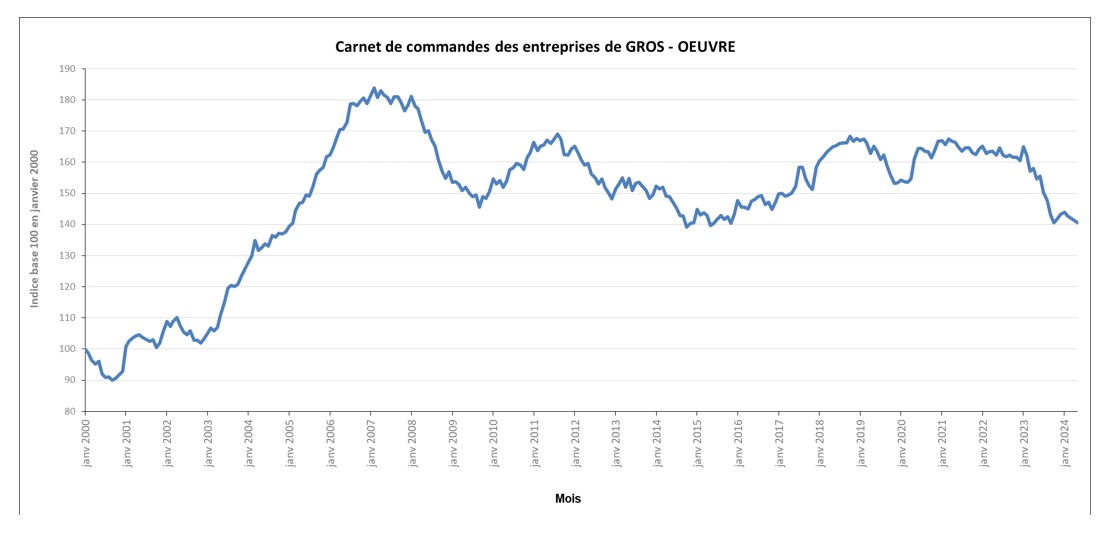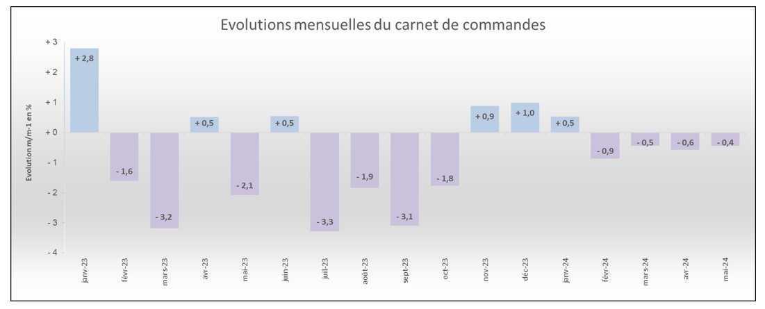 Vous trouverez ci-dessous les variations mensuelles des carnets de commandes1 des entreprises de gros œuvre pour les mois de janvier 2023 à mai 2024.