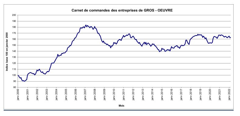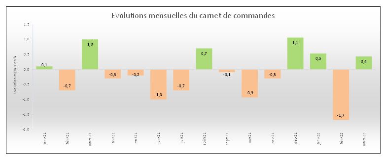Vous trouverez ci-dessous les variations mensuelles des carnets de commandes1 des entreprises de gros œuvre pour les mois de janvier 2021 à mars 2022.