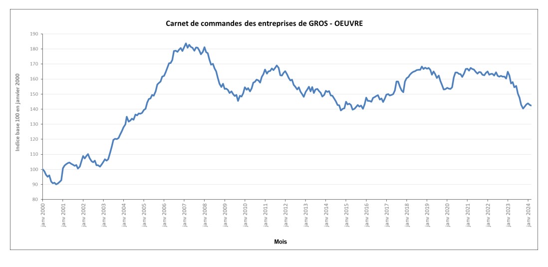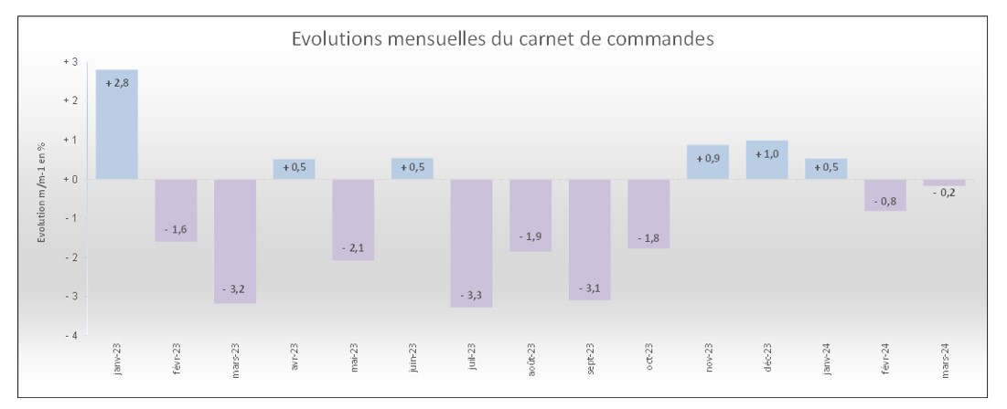 Vous trouverez ci-dessous les variations mensuelles des carnets de commandes1 des entreprises de gros œuvre pour les mois de janvier 2023 à mars 2024.
