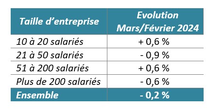 Les carnets de commandes des entreprises de 21 à 50 salariés et de plus de 200 salariés ressortent en baisse modérée. En revanche, ceux des entreprises de 10 à 20 salariés et de 51 à 200 salariés affichent une légère hausse.
