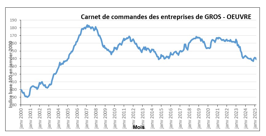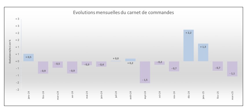 Vous trouverez ci-dessous les variations mensuelles des carnets de commandes1 des entreprises de gros œuvre pour les mois de janvier 2024 à mars 2025.