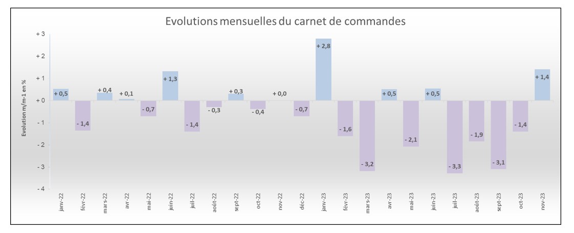Vous trouverez ci-dessous les variations mensuelles des carnets de commandes1 des entreprises de gros œuvre pour les mois de janvier 2022 à novembre 2023.
