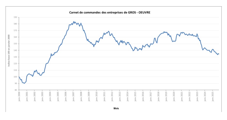 Vous trouverez ci-dessous les variations mensuelles des carnets de commandes1 des entreprises de gros œuvre pour les mois de janvier 2024 à novembre 2025.