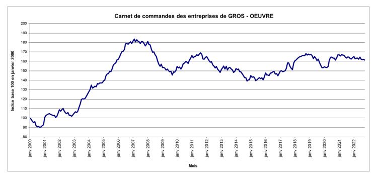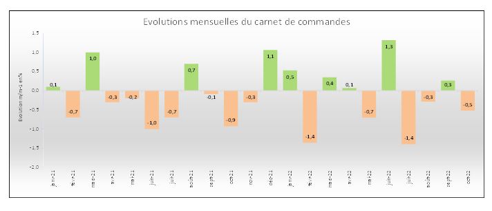 Vous trouverez ci-dessous les variations mensuelles des carnets de commandes1 des entreprises de gros œuvre pour les mois de janvier 2021 à octobre 2022.