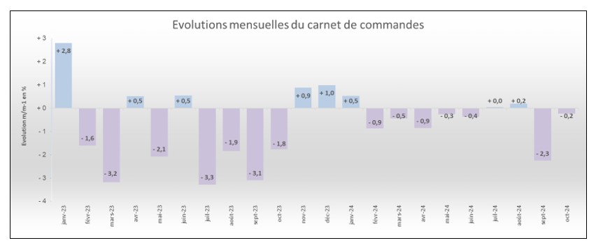 Vous trouverez trouver ci-dessous les variations mensuelles des carnets de commandes1 des entreprises de gros œuvre pour les mois de janvier 2023 à octobre 2024.