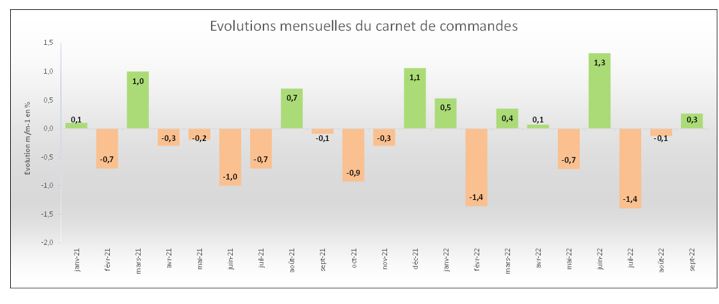 Vous trouverez ci-dessous les variations mensuelles des carnets de commandes1 des entreprises de gros œuvre pour les mois de janvier 2021 à septembre 2022.