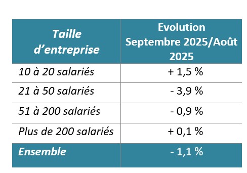Les carnets de commandes des entreprises de 10 à 20 salariés ressortent en hausse, tandis que ceux des entreprises de plus de 200 salariés restent quasi-stables. En revanche, les entreprises de 21 à 200 salariés voient leurs carnets de commandes diminuer, avec une baisse particulièrement marquée pour celles de 21 à 50 salariés.