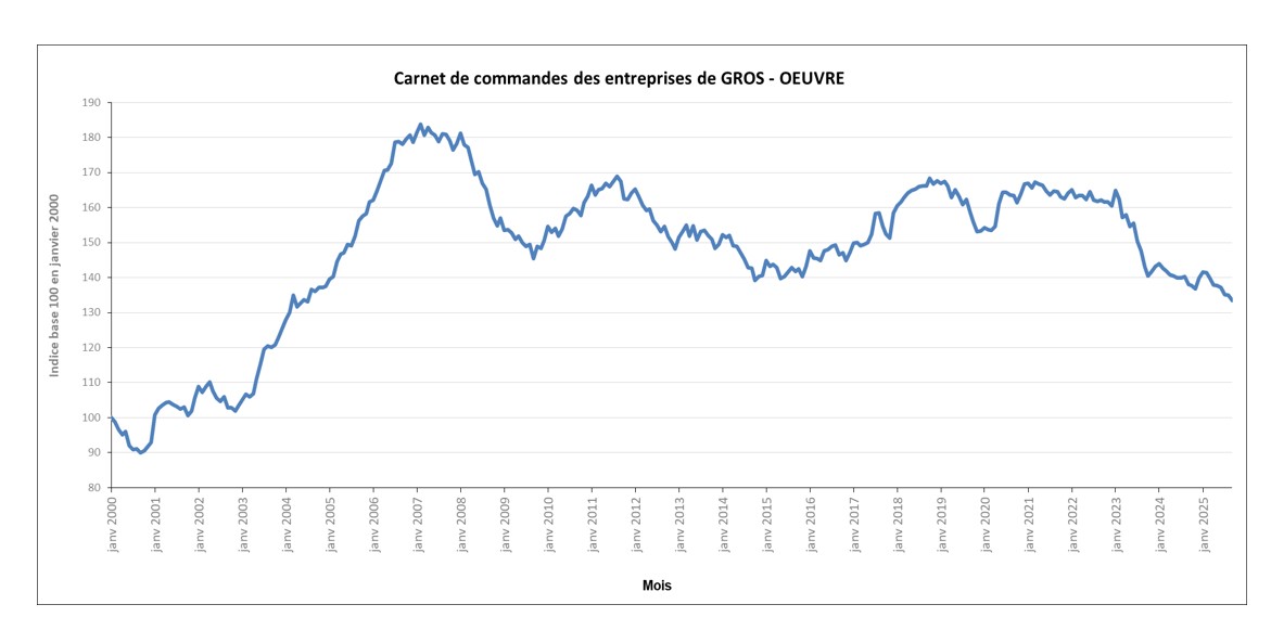 Vous trouverez ci-dessous les variations mensuelles des carnets de commandes1 des entreprises de gros œuvre pour les mois de janvier 2024 à septembre 2025.