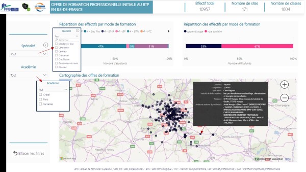 Vous êtes à la recherche d'un lycée professionnel, d'un centre de formation d'apprenti ou d'une école spécifique ayant une filière BTP ? Vous êtes une entreprise à la recherche de stagiaire(s) ou d’apprenti(s) ? Cette cartographie est un bon moyen pour trouver des établissements de formation !