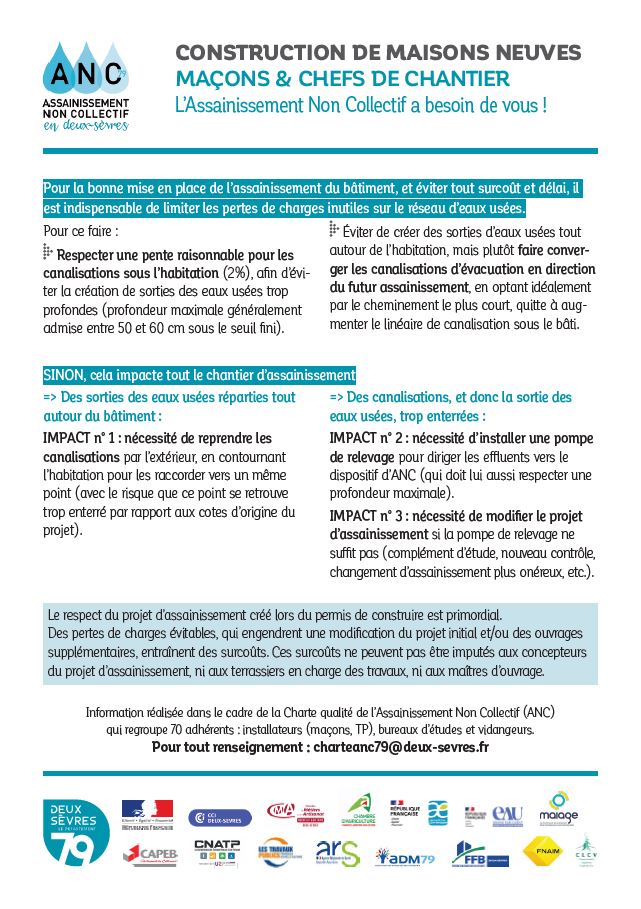 Dans le cadre de la Charte qualité de l'Assainissement Non Collectif 79 (ANC) qui regroupe 70 adhérents : installateurs (maçons, TP), bureaux d'études et vidangeurs, un flyer à destination à été établi.