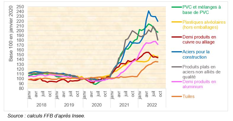 Or, la guerre de l’énergie en Europe, qui se traduit par une explosion des prix du gaz et de l’électricité de 115 % et 114 % entre août 2021 et septembre 2022, entre dans la production de nombre de matériaux « intensifs en énergie » (aluminium, acier, cuivre, verre, tuiles, céramique, ciment, …). Interrogés par l’Insee, les industriels indiquent donc un redressement à venir de leurs prix après le tassement observé pendant l’été.