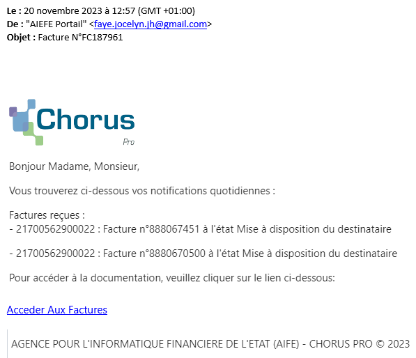 De nombreuses entreprises nous signalent être la cible de courriels, isolés ou répétés, les informant qu’une facture serait à régler sur le portail « Chorus Pro ».