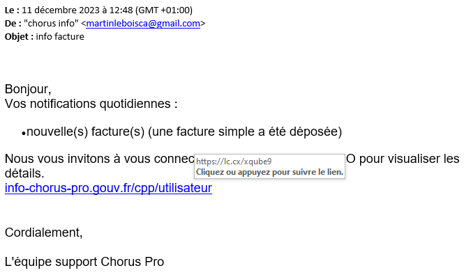 - le lien vous redirigeant vers le paiement, dans les exemples qui nous sont parvenus Accéder aux factures ou encore info-chorus-pro.gouv.fr/cpp/utilisateur / même si le lien affiche une extension « .gouv.fr » mais lorsqu’on passe la souris dessus (sans cliquer) la véritable adresse URL apparait et renvoie vers un lien « https://lc.cx/xqube9 » loin d’être une adresse officielle…