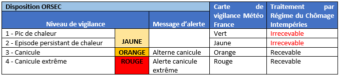 Niveaux de vigilance acceptés ou non par le régime du Chômage Intempéries :