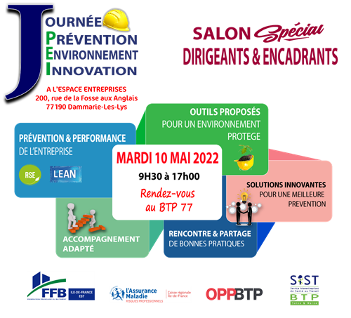 Dirigeants et encadrants du BTP, aujourd’hui pour exercer votre activité, vous devez prendre en compte les exigences réglementaires, sociétales et environnementales. C’est pourquoi le BTP 77 et ses partenaires vous invitent à découvrir, aux travers de stands et de conférences, les outils et les solutions innovantes proposés par la profession. Participer à la Journée Prévention Environnement Innovation (JPEI) qui aura lieu : mardi 10 mai 2022 de 9h30 à 17h00 à l'Espace entreprises - 200 rue de la Fosse aux Anglais à Dammarie-les-Lys