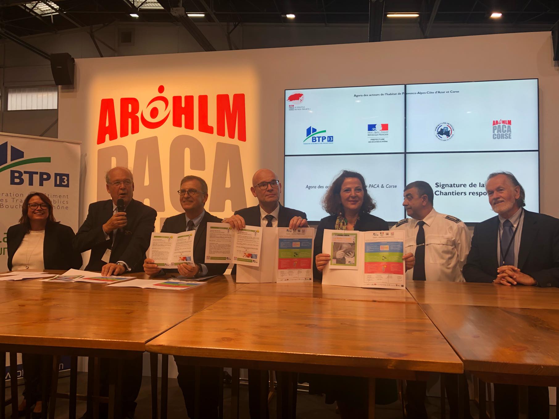 Dans le cadre du congrès HLM de Marseille, Phillippe Deveau, Président de la Fédération du Bâtiment et des Travaux Publics des Bouches-du-Rhône, Bernard Oliver, Président de l’ARHlm PACA & Corse, Olivier De Mazières, Préfet de Police des Bouches-du-Rhône et Marie-Emmanuelle Assidon, Préfète Déléguée pour l’égalité des chances renforcent leur engagement en signant une charte unique en France : a charte « Chantiers Responsables »