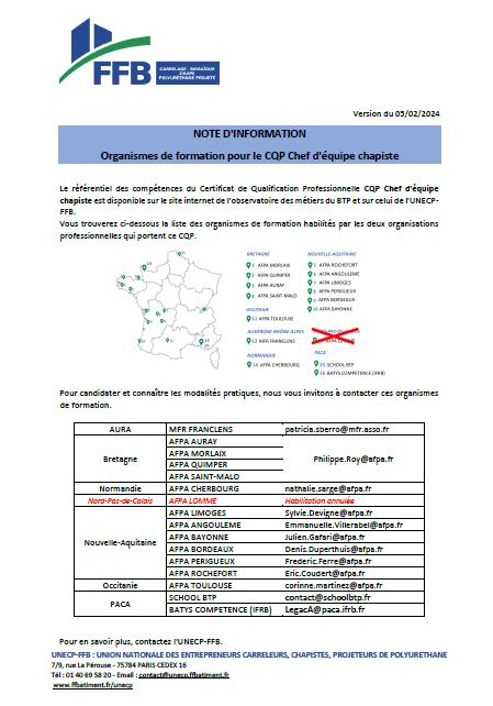 L'UNECP-FFB a mis à jour la note d'information sur le CQP Chef d'équipe chapiste en février 2024.