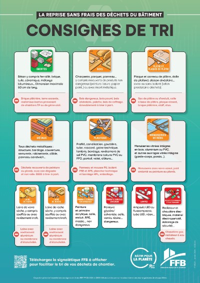 Afin de vous aider à effectuer ce tri, la FFB vient de mettre à en ligne sur son site Déchets de chantier, en complément de sa collection de pictos actualisée récemment, un poster et une signalétique enrichie reprenant l’essentiel des consignes de tri des différentes REP.