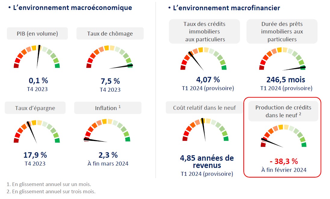 Par ailleurs, l’inflation continue de ralentir, à 2,3 % en mars 2024 sur un an. Les taux des crédits immobiliers aux particuliers s’érodent de 13 points de base pour atteindre 4,07 % en moyenne sur janvier et février 2024, hors frais et assurances. Malgré cette petite amélioration, la production de crédits immobiliers dans le neuf s’effondre de 38,3 % en glissement annuel sur trois mois à fin février 2024.