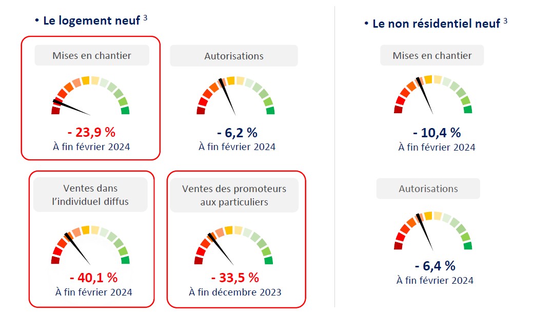 En glissement annuel sur trois mois à fin février 2024, le rythme d’effondrement des mises en chantier se maintient globalement, à -23,9 %. Celui des permis ralentit nettement, à -6,2 %, grâce à un effet de base post-RE2020 dans le collectif (+1,2 %). À l’amont de la filière, les ventes chutent de 40,1 % sur la même période dans l’individuel diffus et de 33,5 % entre les quatrièmes trimestres 2022 et 2023 chez les promoteurs pour celles à destination des particuliers. En revanche, les ventes en bloc progressent de 13,2 %.