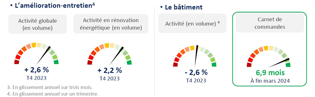 L’activité en amélioration-entretien restait bien orientée au quatrième trimestre 2023, mais ralentissait à +2,6 % en volume sur un an alors qu’elle accélérait de manière continue depuis le printemps 2023. Le ralentissement ressort plus net dans la rénovation énergétique à +2,2 %, après +4,0 % au trimestre précédent. Il est à peu près certain que le tassement s'est accentué depuis, compte tenu de l'effondrement constaté de MaPrimeRénov' suite à la réforme prématurée de l'aide.