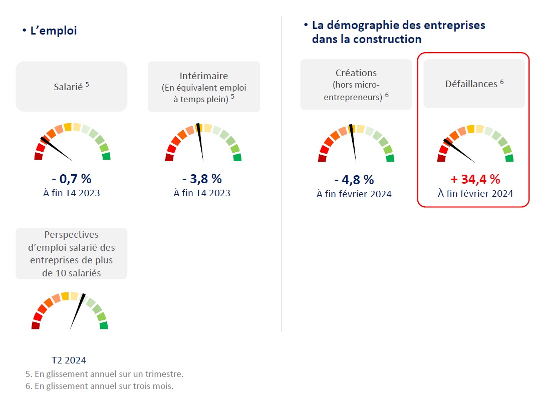En outre, en glissement annuel sur trois mois à fin février 2024, hors micro-entrepreneurs, les créations d’entreprises dans la construction reculent de 4,8 %. Quant aux défaillances, elles poursuivent leur envolée à +34,4 % et dépassent même de 39,0 % leur niveau d'avant crise sanitaire (décembre 2019 à février 2020).
