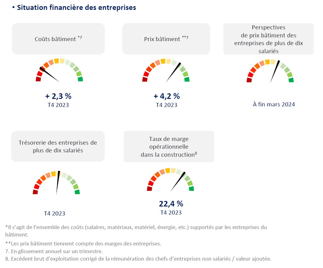 Par ailleurs, on relève une quasi-stabilisation du taux de marge opérationnelle (corrigé de la rémunération du travail des chefs d’entreprise non salariés) dans la construction au quatrième trimestre 2023, à 22,4 %. Il se maintient clairement en-deçà de celui relevé au quatrième trimestre 2019 (26,7 %), avant le déclenchement de la crise sanitaire. Toujours sur le quatrième trimestre 2023, les prix bâtiment ont progressé de 4,2 % en glissement annuel, versus 2,3 % pour les coûts. Enfin, les trésoreries des structures de plus de dix salariés s’améliorent légèrement pour s’afficher un peu au-dessus de leur moyenne de longue période.