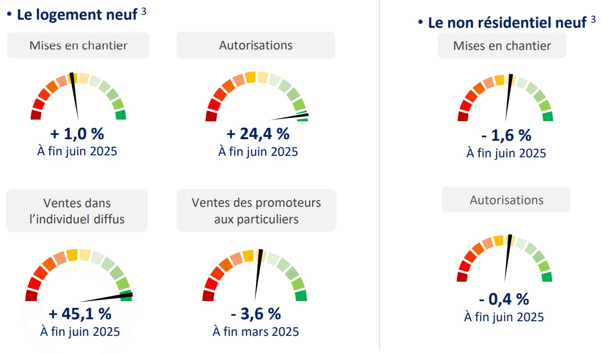 Par ailleurs, l’inflation demeure stable à 1,0 % en juillet 2025 sur un an. En outre, les taux des crédits immobiliers aux particuliers cessent de reculer, s’affichant à 3,07 % en moyenne en juillet, hors frais et assurances. Pour autant, la détente du marché du crédit immobilier perdure, la production dans le neuf progressant de 24,5 % en glissement annuel sur trois mois à fin juillet 2025, du fait notamment de la réouverture du PTZ neuf dans l'individuel et les zones B2 et C.