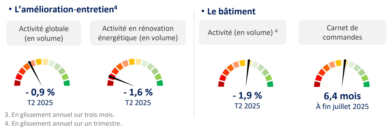 Enfin, la baisse d'activité en amélioration-entretien amorcée fin 2024 reste d'actualité entre les deuxièmes trimestres 2024 et 2025, à -0,9 % en volume. Plus précisément, le logement conserve son rythme de recul (-1,0 %), alors que le repli s'atténue dans le non résidentiel (-0,6 %). Concernant la rénovation énergétique, la situation se dégrade nettement à -1,6 %, emportée par le logement (-2,1 %), alors que le non résidentiel ralentit (+0,5 %).