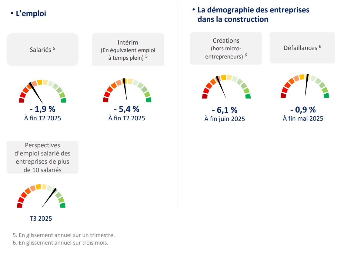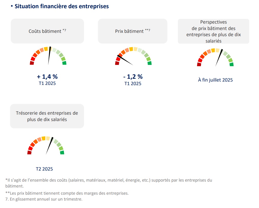 Enfin, au premier trimestre 2025, un effet de ciseau très pénalisant s’est mis en place. De fait, les coûts de production dans le bâtiment ont augmenté de 1,4 % sur un an, tirés par la hausse des salaires, tandis que les prix ont reculé de 1,2 %. Ces mouvements opposés dégradent la situation financière des entreprises. La marge opérationnelle dans la construction perdait 0,5 point de pourcentage au premier trimestre 2025 sur un an, selon les comptes de la Nation. Néanmoins, l'opinion des chefs d'entreprise de plus de dix salariés sur leur trésorerie continue de se maintenir au niveau de sa moyenne de longue période au deuxième trimestre.
