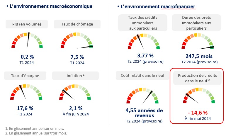 Par ailleurs, l’inflation se tasse encore, à 2,1 % en juin 2024 sur un an. Les taux des crédits immobiliers aux particuliers poursuivent leur baisse pour atteindre 3,77 % en moyenne sur avril et mai 2024, hors frais et assurances. En conséquence, la chute de la production de crédits immobiliers dans le neuf ralentit mais reste conséquente à -14,6 % en glissement annuel sur trois mois à fin mai 2024.