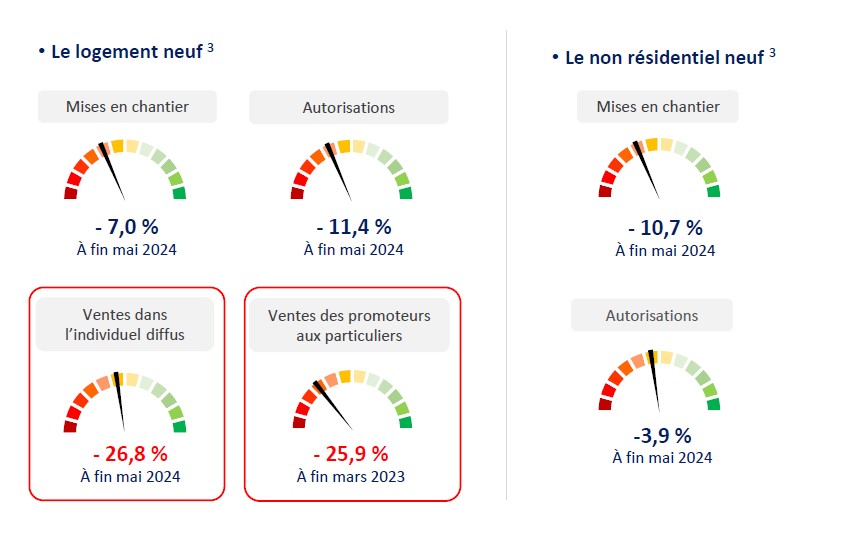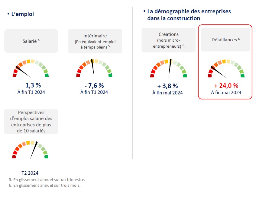 En outre, en glissement annuel sur trois mois à fin mai 2024, hors micro-entrepreneurs, les créations d’entreprises dans la construction progressent à +3,8 %, mais les défaillances s’envolent encore de 24,0 %.