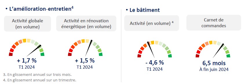 Le ralentissement sur le marché de l’amélioration-entretien se confirme avec une hausse de l’activité en volume limitée à +1,7 % en glissement annuel au premier trimestre 2024, après +2,6 % le trimestre précédent. Comme craint, la réforme trop brutale de MaPrimeRénov’ débouche sur un net tassement de la rénovation énergétique du logement, à +0,6 % après +2,1 % et +3,2 % aux trimestres précédents, que ne compense pas la forte dynamique de celle relative au non résidentiel qui affiche +7,4 %.