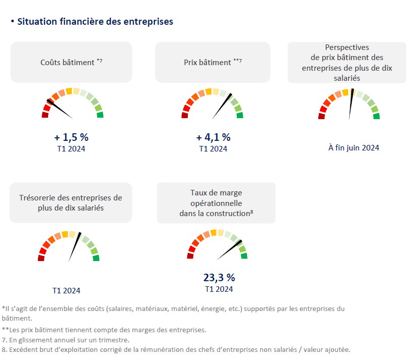 Enfin, on relève une petite baisse du taux de marge opérationnelle (corrigé de la rémunération du travail des chefs d’entreprise non salariés) dans la construction au premier trimestre 2024, à 23,3 %. Ce repli pourrait s’amplifier compte tenu des retours terrain reçus de la FFB. Quant aux trésoreries des structures de plus de dix salariés, elles se stabilisent sur le premier trimestre 2024 pour s’afficher un peu au-dessus de leur moyenne de longue période. Mais, là encore, l’entrée en récession du secteur risque d’infléchir la tendance.