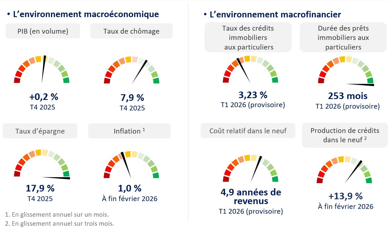 L’inflation demeure contenue en février 2026, à 1,0 % mais les taux des prêts immobiliers aux particuliers poursuivent leur petite remontée, s’affichant à 3,23 % en moyenne en janvier et février, hors frais et assurances. Pour autant, le marché du crédit continue de se redresser, mais plus modérément, la production dans le neuf s’affichant à +13,9 % en glissement annuel sur trois mois à fin février 2026.
