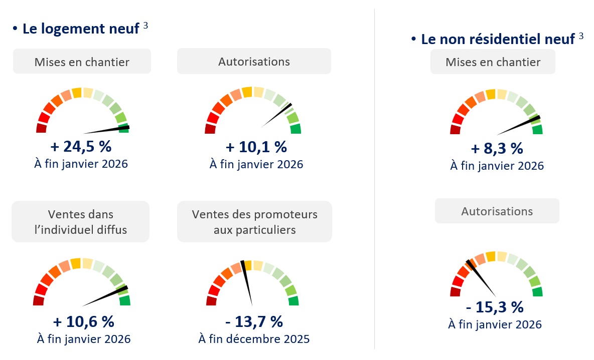 Le non résidentiel neuf connaît une situation contrastée. De fait, en glissement annuel sur trois mois à fin janvier 2026, les surfaces commencées progressent de 8,3 % grâce aux bâtiments publics, aux hébergements hôteliers, aux locaux agricoles et aux commerces. En revanche, les surfaces autorisées chutent de 15,3 %, pénalisées par les bureaux (-7,8 %), les bâtiments agricoles (-9,0 %) ainsi que les bâtiments industriels et assimilés (-37,3 %).