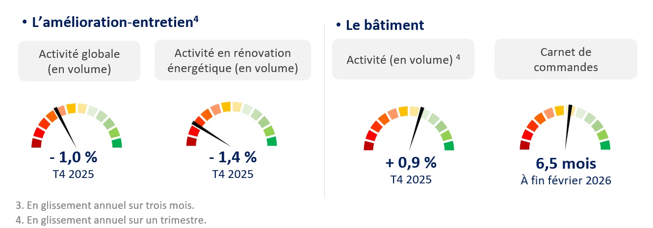 La baisse d'activité en amélioration-entretien, amorcée fin 2024, se poursuit au quatrième trimestre 2025, à -1,0 % en volume. Le mouvement s’observe tout autant pour le logement que le non résidentiel. Concernant la rénovation énergétique, le repli s’accentue un peu à -1,4 %, pénalisé par le logement (-1,7 %), alors que le non résidentiel résiste (-0,3 %).