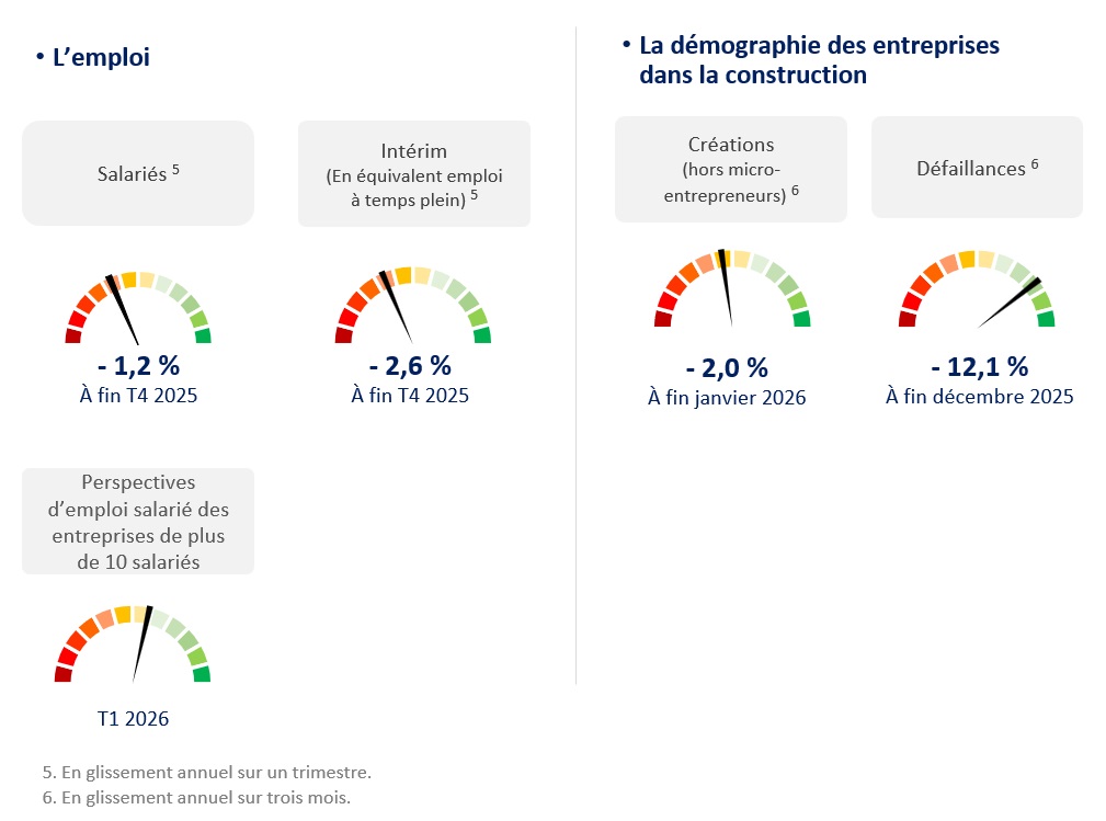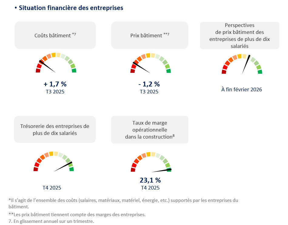 Entre les troisièmes trimestres 2024 et 2025, les coûts de production dans le bâtiment augmentent de 1,7 % sur un an, tirés par la hausse des salaires (+2,3 %), tandis que les prix se replient de 1,2 %. Plus récemment en glissement annuel au quatrième trimestre 2025, le taux de marge opérationnel retrouve un peu de vigueur avec une hausse de 0,3 point de pourcentage, pour s’établir à 23,1%. Sur la même période, l’opinion des chefs d'entreprise de plus de dix salariés sur leur trésorerie s’améliore, mais leurs perspectives de prix à trois mois restent déprimées.