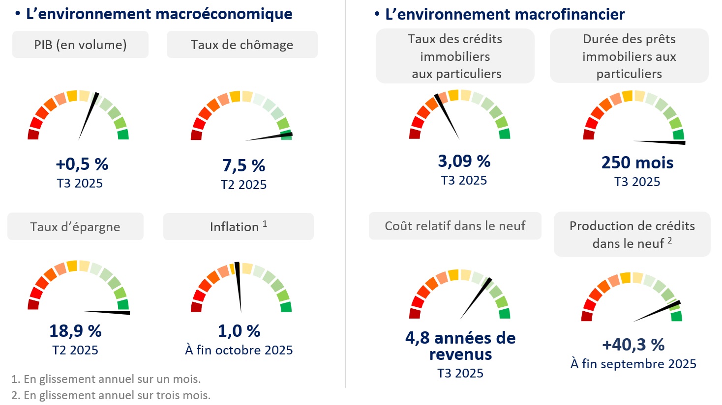 L’inflation se place à 1,0 % en octobre 2025 sur un an et les taux des crédits immobiliers aux particuliers restent quasi-stables, s’affichant à 3,09 % au troisième trimestre, hors frais et assurances. Pour autant, le marché du crédit poursuit sa détente. Dans le neuf, la production progresse de 40,3 % sur trois mois à fin septembre 2025, grâce à la réouverture du PTZ (individuel et zones B2-C dans le neuf). Toutefois, cette situation pourrait se durcir, notamment sous l’effet de la hausse du taux de l'OAT à dix ans depuis l'été.