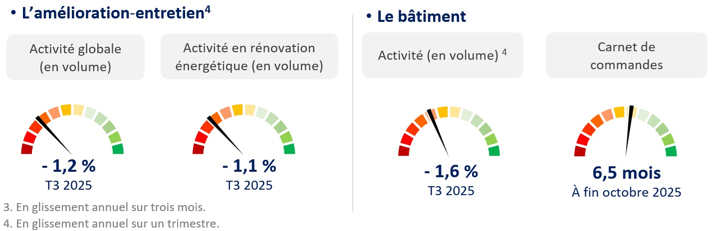 Enfin, la baisse d'activité en amélioration-entretien amorcée fin 2024 se confirme entre les troisièmes trimestres 2024 et 2025, à -1,2 % en volume. Plus précisément, la situation pour le logement s’aggrave (-1,4 %), alors que le rythme de repli du non résidentiel se maintient (-0,6 %). Concernant la rénovation énergétique, la baisse se tempère un peu à -1,1 %, dans le sillage du logement (-1,2 %), alors que le non résidentiel s’érode pour la première fois depuis le premier trimestre 2023 (-0,4 %).