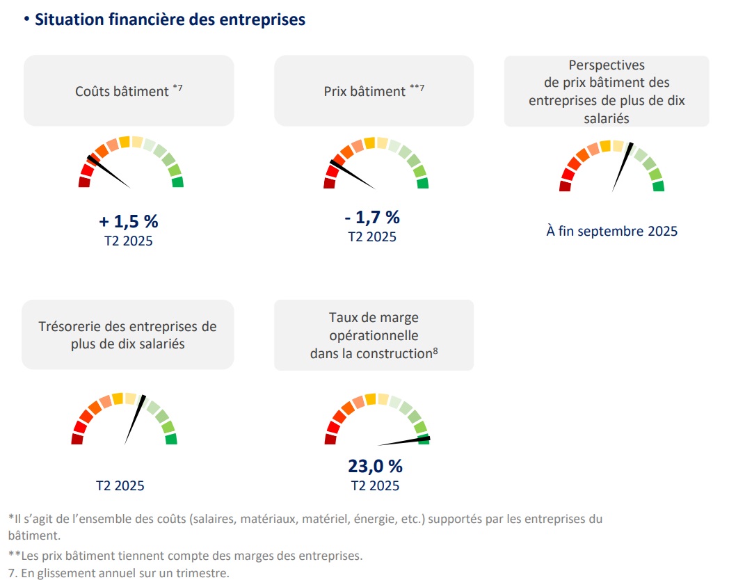Enfin, au deuxième trimestre 2025, un effet de ciseau très pénalisant se poursuit. De fait, les coûts de production dans le bâtiment ont augmenté de 1,5 % sur un an, tirés par la hausse des salaires (+2,6 %) tandis que les prix se sont repliés de 1,7 %. Ces mouvements opposés dégradent la situation financière des entreprises, avec un taux de marge opérationnelle abandonnant encore 0,3 point de pourcentage par rapport au deuxième trimestre 2024. Pour autant, l'opinion des chefs d'entreprise de plus de dix salariés sur leur trésorerie se maintient au niveau de sa moyenne de longue période.