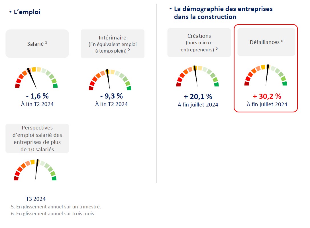 En outre, en glissement annuel sur trois mois à fin juillet 2024, hors micro-entrepreneurs, les créations d’entreprises dans la construction accélèrent, à +20,1%. Quant aux défaillances, même si elles affichent +30,2 % sur la même période, elles n’accélèrent plus.