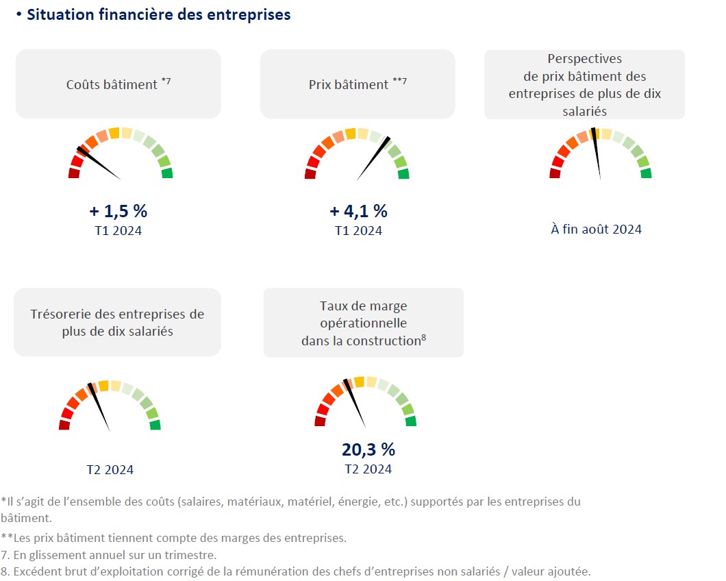 Enfin, pour ce qui concerne la situation financière des entreprises, les trésoreries des structures de plus de dix salariés se tassent sur le deuxième trimestre 2024 pour s’afficher quasiment à leur moyenne de longue période, et l’on relève une petite baisse du taux de marge opérationnelle (corrigé de la rémunération du travail des chefs d’entreprise non salariés) dans la construction, à 20,3 %, toujours au deuxième trimestre 2024.