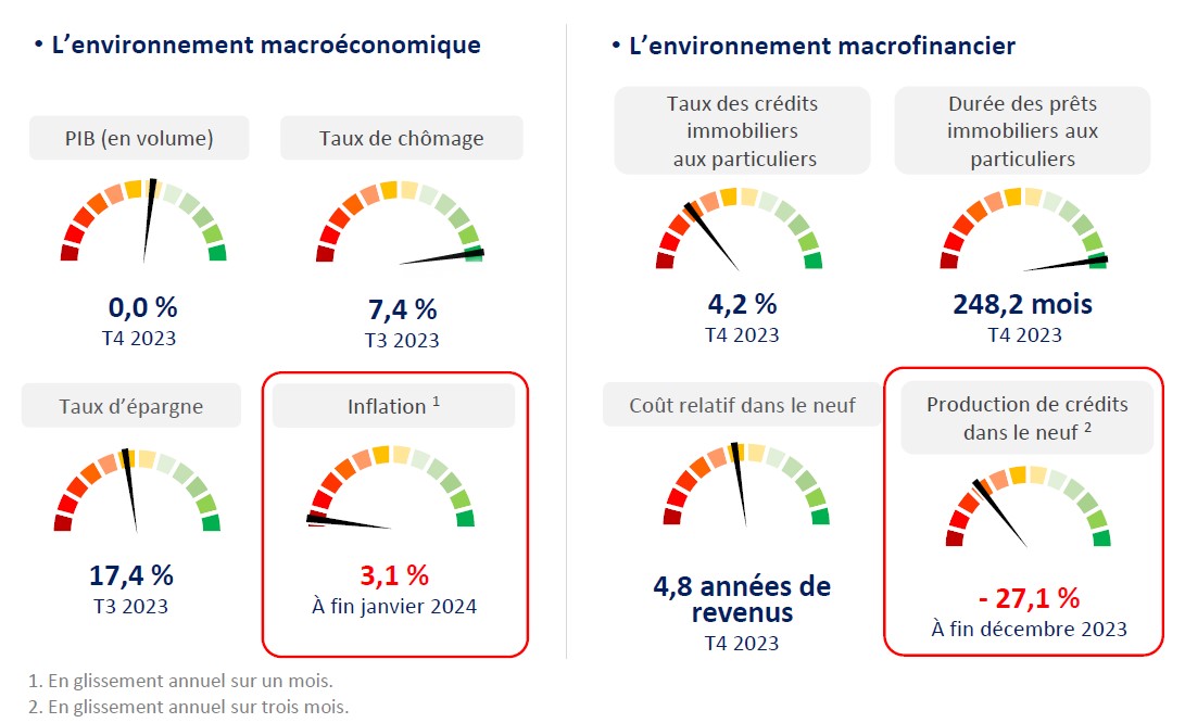 L’inflation continue de ralentir, à 3,1 % en janvier 2024 sur un an. Les taux des crédits immobiliers aux particuliers poursuivent, quant à eux, leur remontée à 4,2 % en moyenne sur le quatrième trimestre 2023, hors frais et assurances, alors que les taux longs sur les marchés financiers fléchissent déjà. Enfin, la production de crédits immobiliers dans le neuf s’effondre de 27,1 % en glissement annuel sur trois mois à fin décembre 2023.